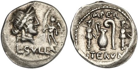 L. Sulla, Denarius, military mint, 84-3 BC. AR (g 3,84; mm 20; h 12). Diademed head of Venus r.; to r., Cupid standing l., holding palm frond; L•SVLLA below, Rv. Capis and lituus between two trophies; IMPER above, ITERV below. Crawford 359/2; Cornelia 30; Sydenham 761a. Scarce, good very fine
