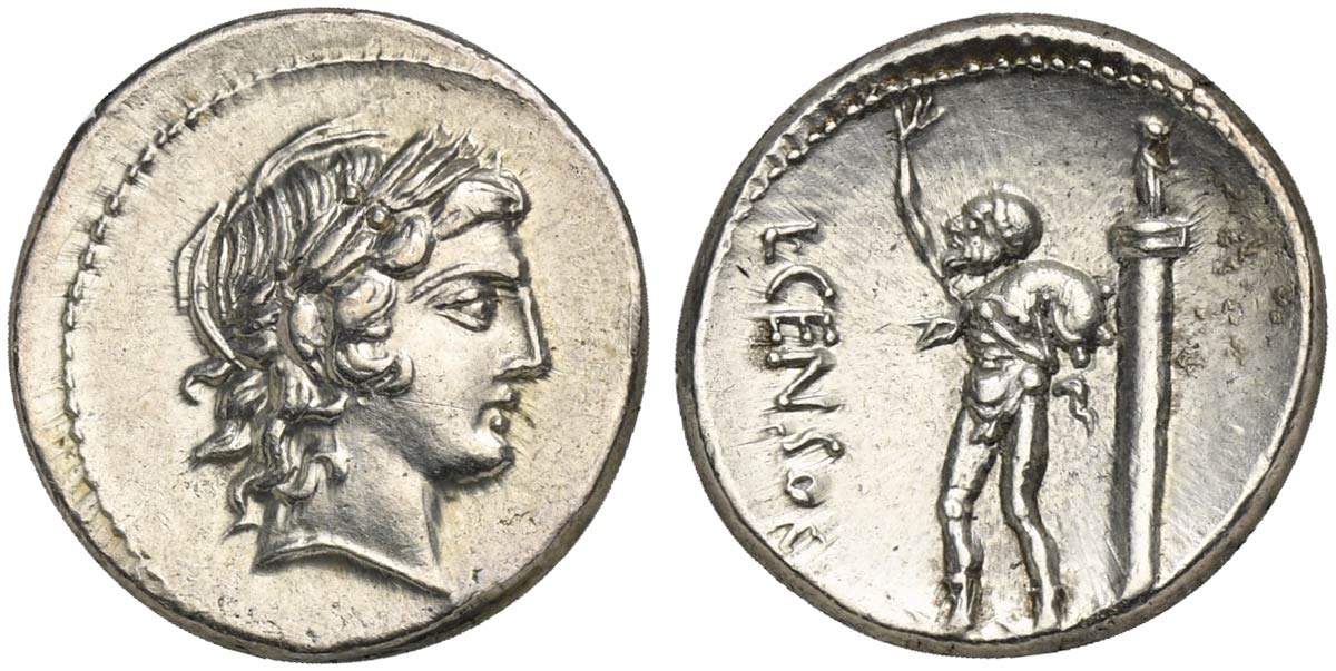L. Censorinus, Denarius, Rome, 82 BC. AR (g 3,73; mm 17; h 5). Laureate head of Apollo r., Rv. Marsyas standing l., holding wineskin over shoulder; to r., column surmounted by statue of Minerva(?) standing l.; L•CENSOR to l. Crawford 363/1d; Marcia 24; Sydenham 737. Extremely fine