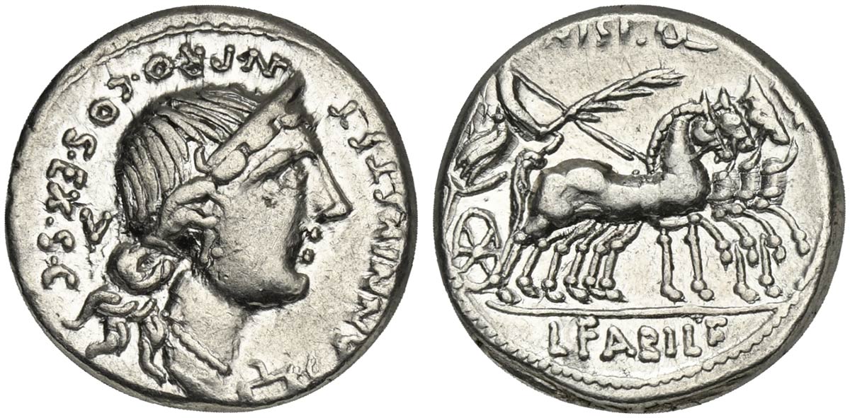 C. Annius T.f. T.n and L. Fabius L.f. Hispaniensis, Denarius, Northern Italy or Spain, 82-81 BC. AR (g 3,80; mm 18; h 8). Draped bust of Anna Perenna r., wearing stephane; scales below chin, V behind head, C•ANNIVS•T•F•T•N•PRO•COS•EX•S•C around, Rv. Victory driving galloping quadriga r., holding palm frond and reins; HISP•Q above, L•FABI•L•F in exergue. Crawford 366/3a; Annia 5a; Sydenham 748f. Good very fine