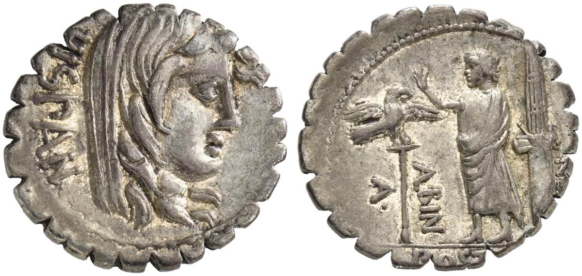 Lot 847 | A. Postumius A.f. Sp.n. Albinus, Denarius serratus, Rome, 81 BC. AR (g 3,48; mm 19; h 6). Veiled head of Hispania r.; behind, HISPAN, Rv. Togate figure with hand raised, standing r. between legionary eagle and fasces with axe; aro