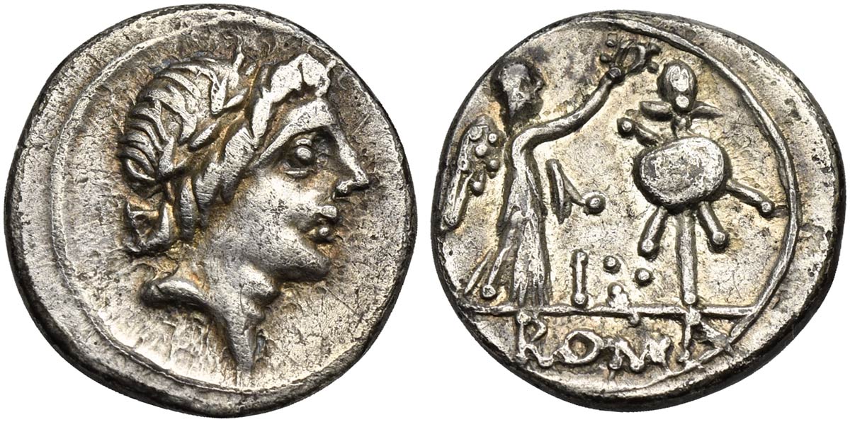 Anonymous, Quinarius, Rome, 81 BC. AR (g 1,83; mm 14; h 5). Laureate head of Apollo r., Rv. Victory standing r., crowning trophy; control mark between; ROMA in exergue. Crawford 373/1b; RSC 227a; Sydenham 609a. Good very fine