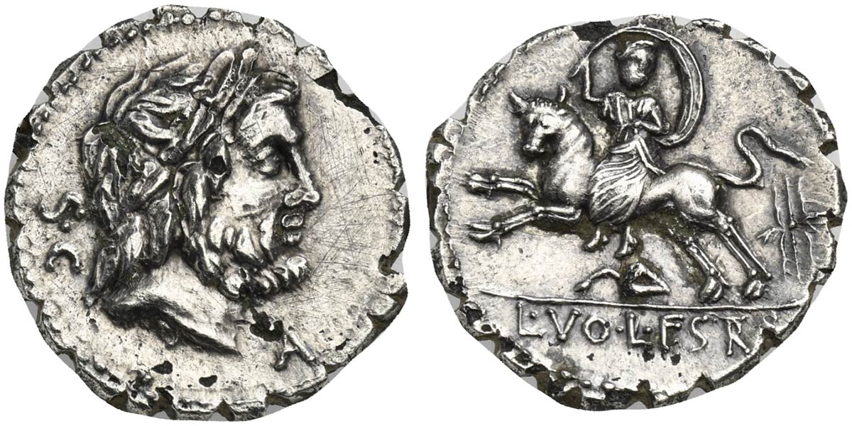 L. Volteius L.f. Strabo, Serrate Denarius, Rome, 81 BC. AR (g 3,28; mm 20; h 11). Laureate head of Jupiter r.; S•C behind, A below chin, Rv. Europa seated on bull galloping l., holding veil over head; thunderbolt to r.; below, vine leaf r.; L•VO•L•F•S(TR)(AB) in exergue. Crawford 377/1; Volteia 6; Sydenham 743. Good very fine