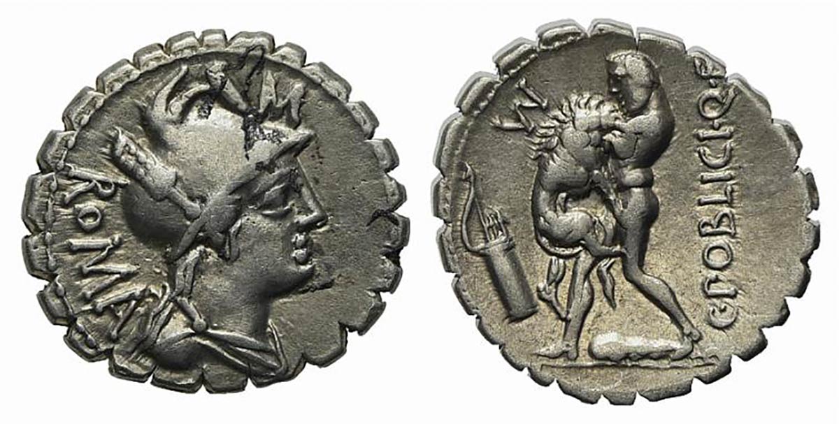 Lot 857 | C. Poblicius Q.f., Serrate Denarius, Rome, 80 BC. AR (g 3,95; mm 20; h 4). Helmeted and draped bust of Roma r.; M above, ROMA behind, Rv. Hercules standing l., strangling Nemean Lion; club at his feet; bow and arrows to l.; M abov