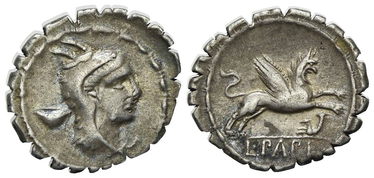 L. Papius, Serrate Denarius, Rome, 79 BC. AR (g 3,76; mm 20,5; h 12). Head of Juno Sospita r., wearing goat’s skin headdress; vase behind, Rv. Griffin springing r.; rhyton below; L•PAPI in exergue. Crawford 384/1 (symbols 33); Pap