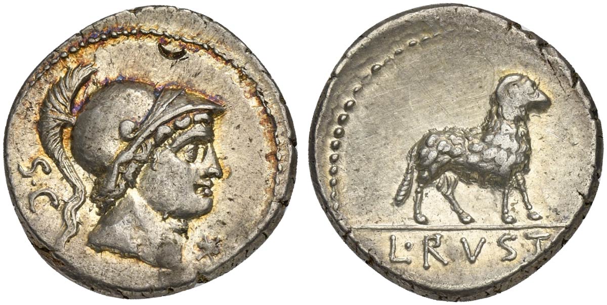 L. Rustius, Denarius, Rome, 74 BC. AR (g 3,96; mm 19; h 6). Helmeted head of Mars r.; S•C behind, denomination mark before, Rv. Ram standing r.; L•RVST[I] in exergue. Crawford 389/1; Rustia 1; Sydenham 782. Iridescent tone, very f