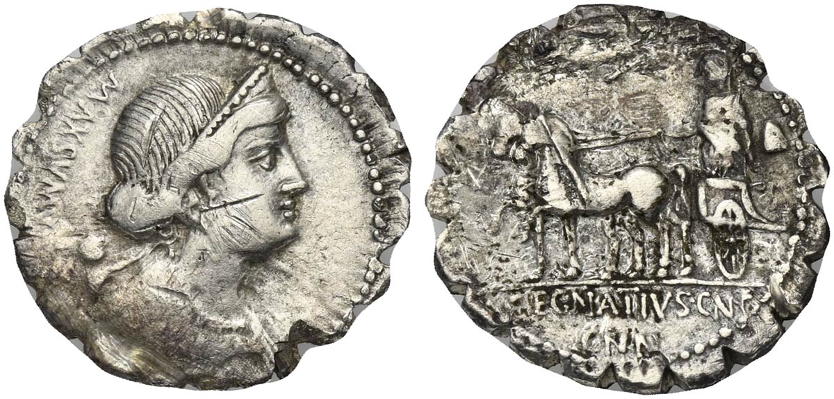 Cn. Egnatius Cn.f. Cn.n. Maxsumus, Denarius, Rome, 76 BC. AR (g 3,86; mm 20; h 5). Diademed and draped bust of Venus r., cupid on shoulder; MAXSVMVS behind, Rv. Liberty in walking quadriga r., crowned by Victory; C•EGNATIVS•CN•F / CN•N in exergue. Crawford 391/1a; Egnatia 1; Sydenham 786. Rare, scratch on obv., good fine - near very fine