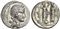 Cn. Egnatius Cn.f. Cn.n. Maxsumus, Denarius, Rome, 76 BC. AR (g 3,65; mm 18; h 7). Diademed and draped bust of Libertas r.; MAXSVMVS and pileus to l., Rv. Roma, holding staff and sword, foot on wolf's head, and Venus, holding staff, standing facing; Cupid alighting on the shoulder of Venus; rudder standing on prow on either side; control mark to l.; C•EGN(AT)IVS•CN•F below, [CN•N] to r. Crawford 391/3; Egnatia 2; Sydenham 787. Good very fine