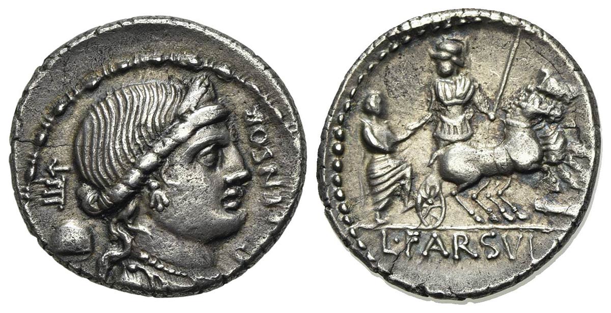 L. Farsuleius Mensor, Denarius, Rome, 76 BC. AR (g 3,85; mm 18,5; h 7). Diademed and draped bust of Libertas r.; control mark and pileus behind, MENSOR before, S•C below chin. R/ Roma in biga r., assisting togate figure into chariot and holding spear and reins; scorpion below horses; L•FARSVL[EI] in exergue. Crawford 392/1a; Farsuleia 1; Sydenham 789a. Good very fine