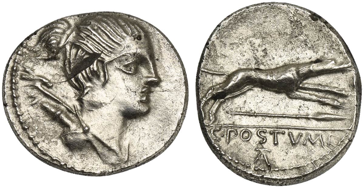 C. Postumius At or Ta, Denarius, Rome, 74 BC. AR (g 3,66; mm 18; h 3). Draped bust of Diana r., with bow and quiver over shoulder, Rv. Hound running r.; below, spear; in ex. C POSTVMI / AT (or TA). Crawford 394/1a; Postumia 9; Sydenham 785. Very fine