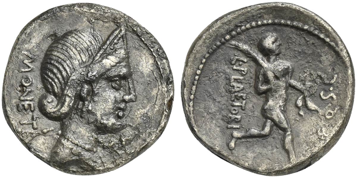 L. Plaetorius L.f. Cestianus, Denarius, Rome, 67 BC. AR (g 3,37; mm 19; h 8). Diademed and draped bust of Juno Moneta r.; MONETA behind, S•C below chin, Rv. Athlete advancing r., holding palm frond and caestus; L•PLAETORI behind,