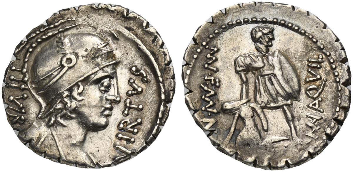 Mn. Aquillius Mn. f. Mn. n., Serrate Denarius, Rome, 71 BC. AR (g 3,99; mm 20; h 6). Helmeted bust of Virtus r.; IIIVIR behind, VIRTVS before, Rv. The consul Manius Aquillius standing facing, holding shield and raising slumped Sic