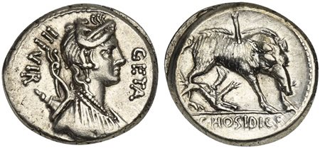 C. Hosidius C.f. Geta, Denarius, Rome, 64 BC. AR (g 3,89; mm 18; h 5). Diademed and draped bust of Diana r., with bow and quiver over shoulder; III•VIR behind, GETA before, Rv. Calydonian Boar standing r., pierced by spear and har