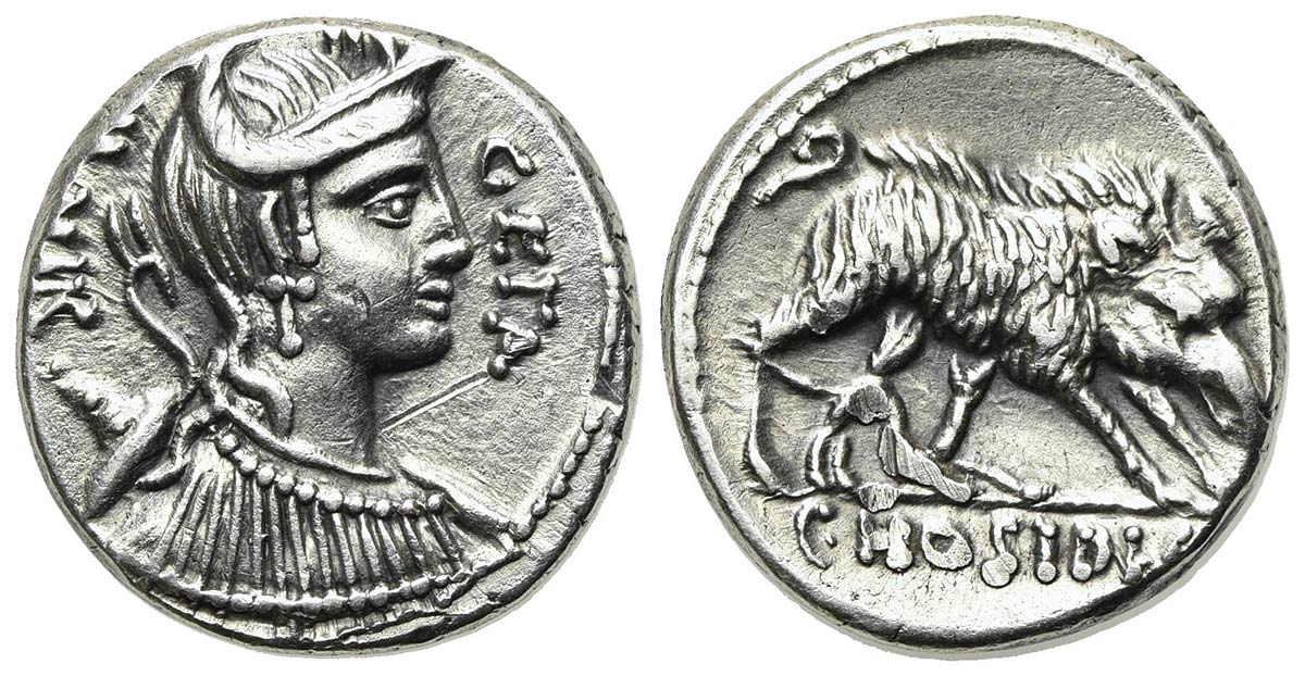 C. Hosidius C.f. Geta, Denarius, Rome, 64 BC. AR (g 3,91; mm 16; h 6). Diademed and draped bust of Diana r., with bow and quiver over shoulder; III•VIR behind, GETA before, Rv. Calydonian Boar standing r., pierced by spear and har