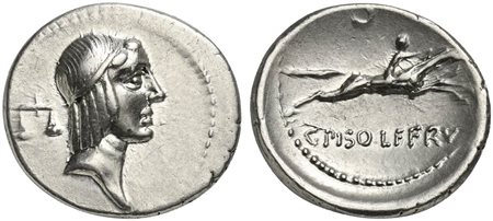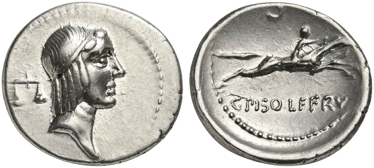 C. Piso L.f. Frugi, Denarius, Rome, 61 BC. AR (g 3,86; mm 19; h 5). Head of Apollo r., hair bound with taenia; scale behind, Rv. Horseman galloping r., holding reins and palm branch; crescent above, C•PISO•L•FRV below. Crawford 40