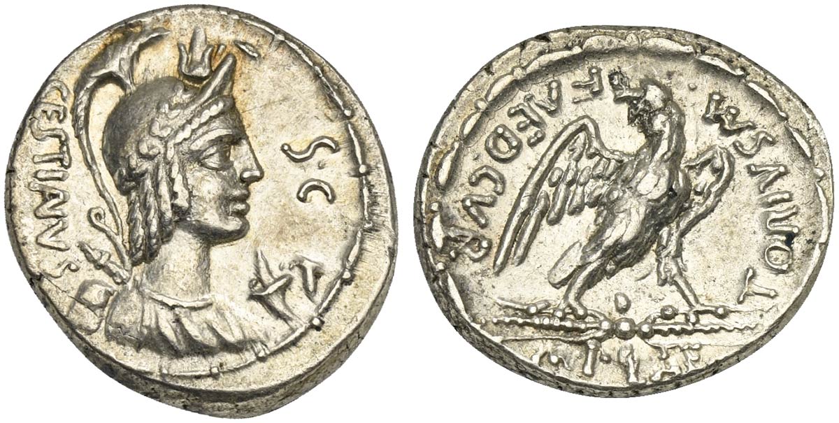 M. Plaetorius M.f. Cestianus, Denarius, Rome, 57 BC. AR (g 3,84; mm 19; h 4). Helmeted and draped bust r., with attributes of Isis, Minerva, Apollo, Diana, and Victory; cornucopia below chin; CESTIANVS behind, S•C before, Rv. Eagl
