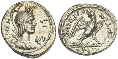 M. Plaetorius M.f. Cestianus, Denarius, Rome, 57 BC. AR (g 3,84; mm 19; h 4). Helmeted and draped bust r., with attributes of Isis, Minerva, Apollo, Diana, and Victory; cornucopia below chin; CESTIANVS behind, S•C before, Rv. Eagle standing r. on thunderbolt, head l.; M•PLAETORIVS•M•F•AED•CVR around. Crawford 409/1; Plaetoria 4; Sydenham 809. Extremely fine