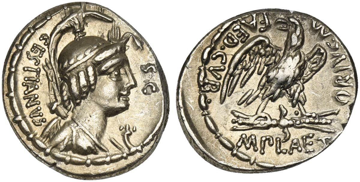 M. Plaetorius M.f. Cestianus, Denarius, Rome, 57 BC. AR (g 3,74; mm 19; h 5). Helmeted and draped bust r., with attributes of Isis, Minerva, Apollo, Diana, and Victory; cornucopia below chin; CESTIANVS behind, S•C before, Rv. Eagl