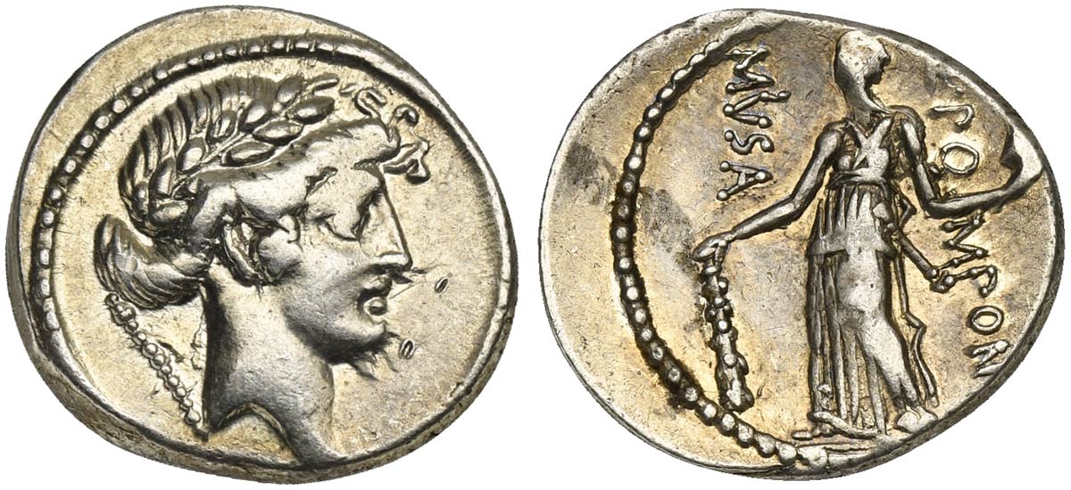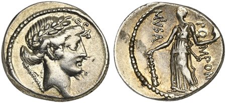 Q. Pomponius Musa, Denarius, Rome, 56 BC. AR (g 3,83; mm 19; h 6). Laureate head of Apollo r.; sceptre to l., Rv. Melpomene, the Muse of Tragedy, wearing long flowing tunic and peplum and sword, standing l., holding club set on gr