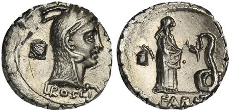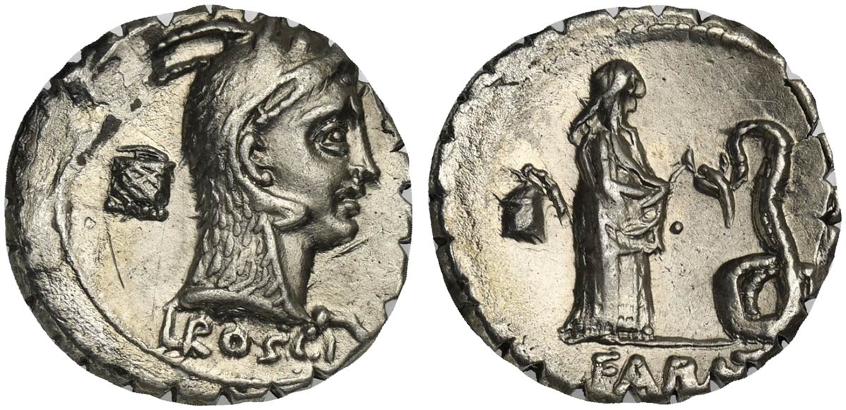 L. Roscius Fabatus, Denarius, Rome, 59 BC. AR (g 3,70; mm 18; h 6). Head of Juno Sospita r.; symbol behind; L•ROSCI below, Rv. Female standing r. before serpent; symbol to l.; FABATI in exergue. Crawford 412/1; Roscia 3; Sydenham 915. Good very fine
