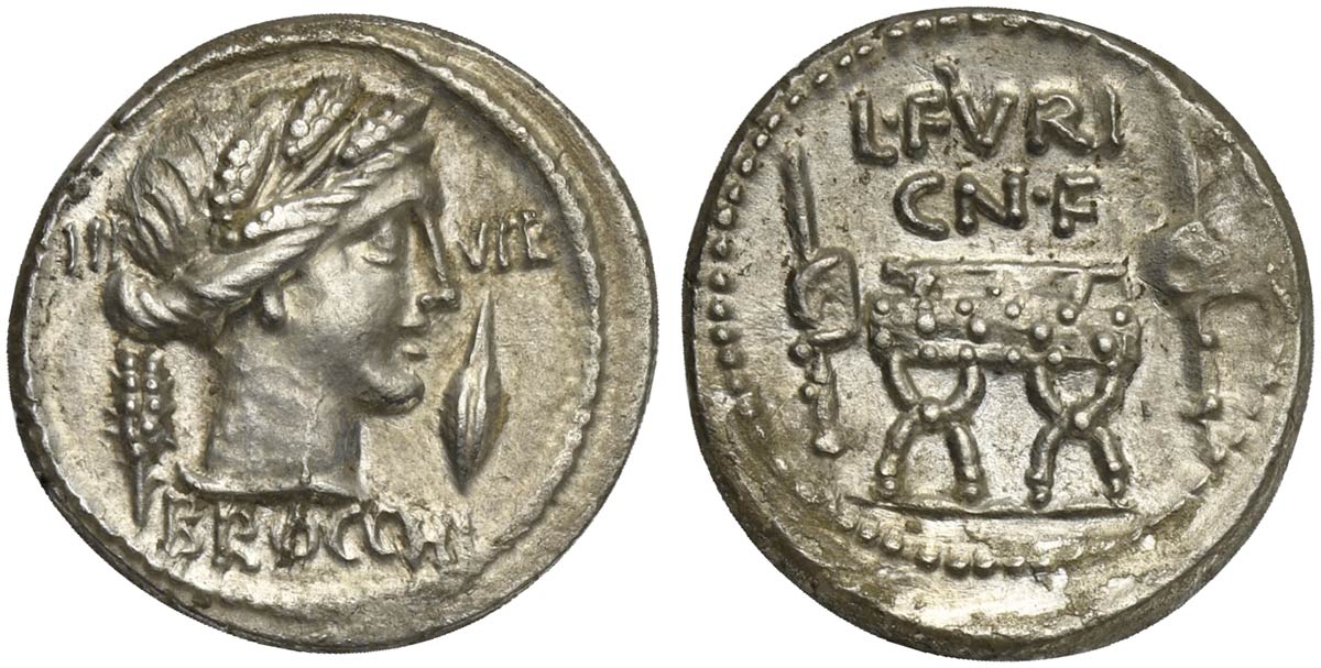 L. Furius Cn.f. Brocchus, Denarius, Rome, 63 BC. AR (g 4,00; mm 19; h 5). Head of Ceres r., wearing wreath of grain ears, a lock of hair falling down her neck; grain stalk behind, single grain before; III VIR to either side, BROCC