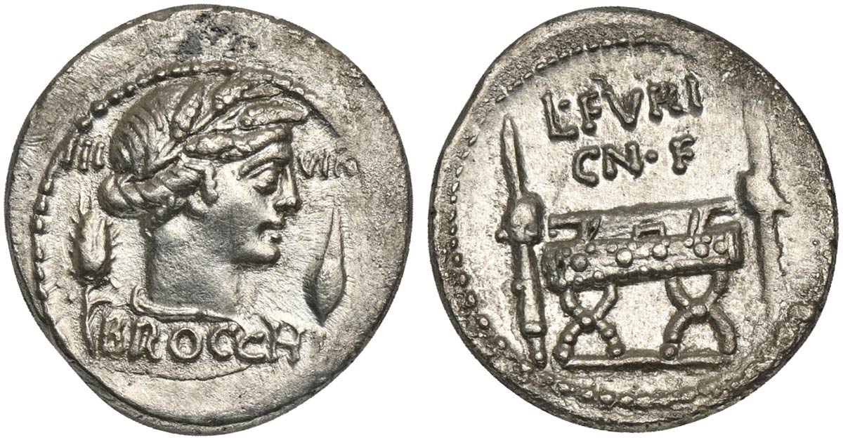 L. Furius Cn.f. Brocchus, Denarius, Rome, 63 BC. AR (g 3,71; mm 20; h 6). Head of Ceres r., wearing wreath of grain ears, a lock of hair falling down her neck; grain stalk behind, single grain before; III VIR to either side, BROCC