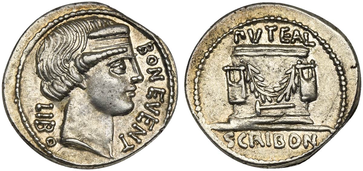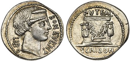 L. Scribonius Libo, Denarius, Rome, 62 BC. AR (g 3,77; mm 21; h 6). Diademed head of Bonus Eventus r.; LIBO behind, BON•EVENT before, Rv. Puteal Scribonianum (Scribonian wellhead), decorated with garland and two lyres; hammer at b
