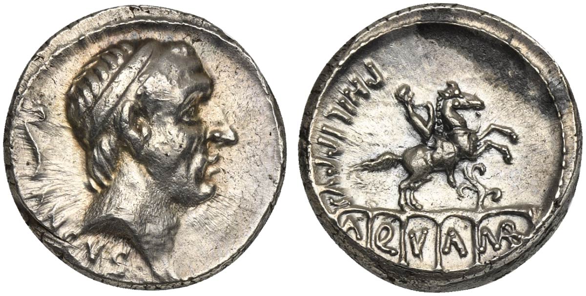 L. Marcius Philippus, Denarius, Rome, 57 BC. AR (g 3,92; mm 18; h 7). Diademed head of Ancus Marcius r.; ANCVS and lituus to l., Rv. Equestrian statue r. on aqueduct; flower below horse; PHILIPPVS above, AQVA(MAR) below. Crawford