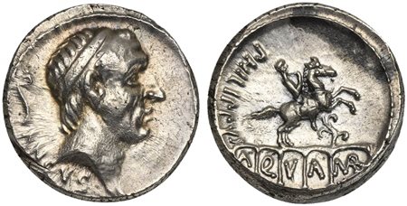 L. Marcius Philippus, Denarius, Rome, 57 BC. AR (g 3,92; mm 18; h 7). Diademed head of Ancus Marcius r.; ANCVS and lituus to l., Rv. Equestrian statue r. on aqueduct; flower below horse; PHILIPPVS above, AQVA(MAR) below. Crawford 425/1; Marcia 28; Sydenham 919. Toned, some oxydation, extremely fine