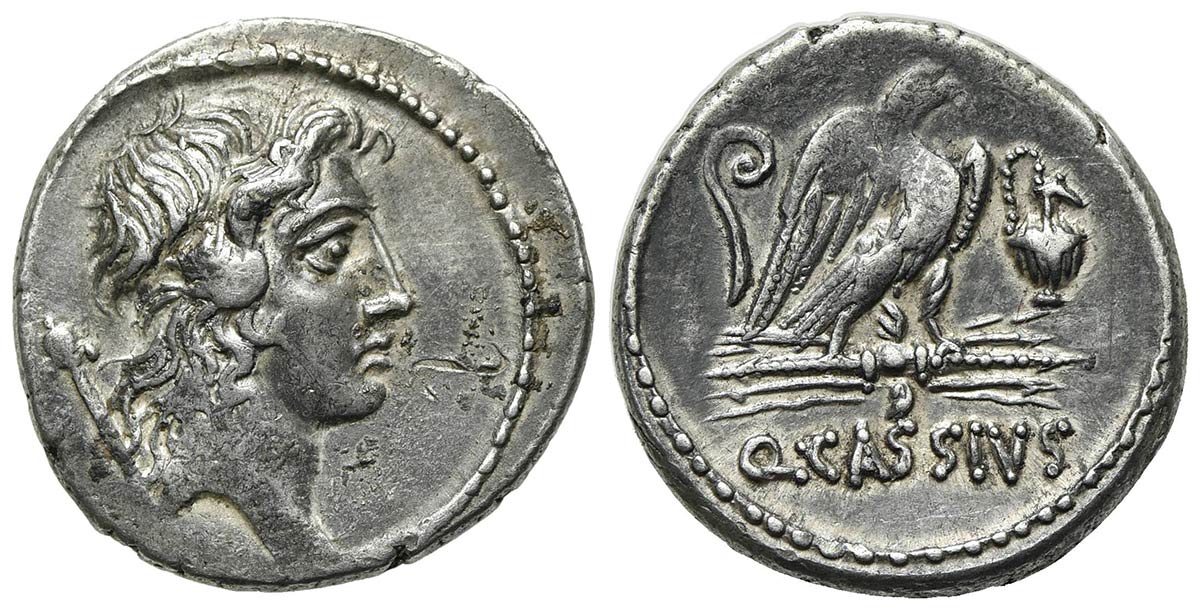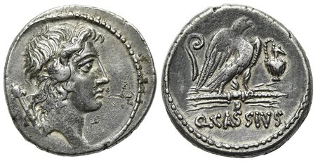 Q. Cassius Longinus, Denarius, Rome, 55 BC. AR (g 3,54; mm 19; h 6). Head of Bonus Eventus (or Genius Populi Romani?) r.; sceptre behind, Rv. Eagle standing r. on thunderbolt; lituus to l., capis to r.; Q•CASSIVS below. Crawford 4