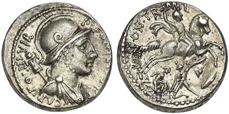 P. Fonteius P.f. Capito, Denarius, Rome, 55 BC. AR (g 4,03; mm 18; h 3). Helmeted and draped bust of Mars r.; trophy behind; P•FONTEIVS•P•F•CAPITO•III•VIR around, Rv. Warrior on horseback galloping r., thrusting spear downwards at kneeling enemy in Gallic helmet, who holds sword and shield; to lower l., another enemy warrior, kneeling r.; Gallic helmet and shield to lower r.; (MN)•FO(NT)•TR•MIL. Crawford 429/1; Fonteia 17; Sydenham 900. Very fine - good very fine