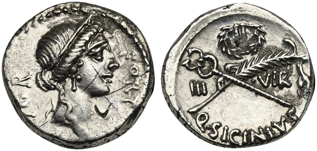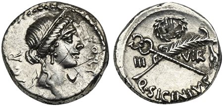 Q. Sicinius, Denarius, Rome, early 49 BC. AR (g 3,76; mm 17; h 5). Diademed head of Fortuna Populi Romani r.; FORT before, P•R behind, Rv. Palm frond with fillet and winged caduceus in saltire; wreath above; Q•SICINIVS below, III