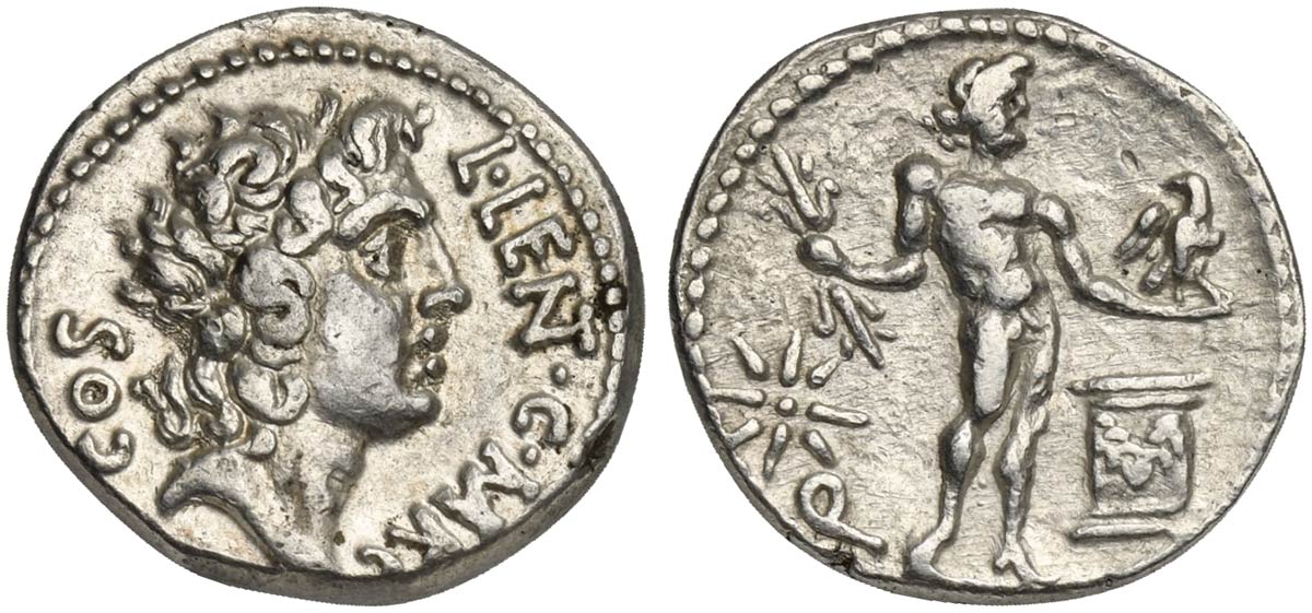 L. Cornelius Lentulus and C. Claudius Marcellus, Denarius, Apollonia in Illyricum, April-June 49 BC. AR (g 3,88; mm 19; h 5). Head of Apollo r.; L•LE(NT)•C•(MA)RC before, COS behind, Rv. Jupiter standing r., holding thunderbolt an