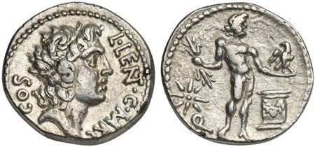 L. Cornelius Lentulus and C. Claudius Marcellus, Denarius, Apollonia in Illyricum, April-June 49 BC. AR (g 3,88; mm 19; h 5). Head of Apollo r.; L•LE(NT)•C•(MA)RC before, COS behind, Rv. Jupiter standing r., holding thunderbolt and eagle; star and Q behind, altar before. Crawford 445/2; Cornelia 65; Sydenham 1030. Good very fine