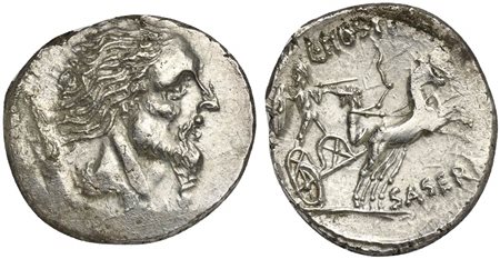 L. Hostilius Saserna, Denarius, Rome, 48 BC. AR (g 3,88; mm 19; h 3). Head of captive Gallic warrior (Vercingetorix?) r.; Gallic shield to l., Rv. Two warriors in galloping biga r., one driving and the other holding shield and bra