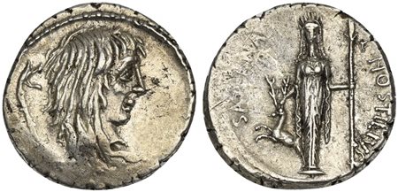 L. Hostilius Saserna, Denarius, Rome, 48 BC. AR (g 4,03; mm 19; h 8). Head of Gallia r.; Gallic trumpet (carnyx) behind, Rv. Diana of Ephesus standing facing, holding spear and stag by its antler; L•HOSTILIVS to r., SASERNA to l.