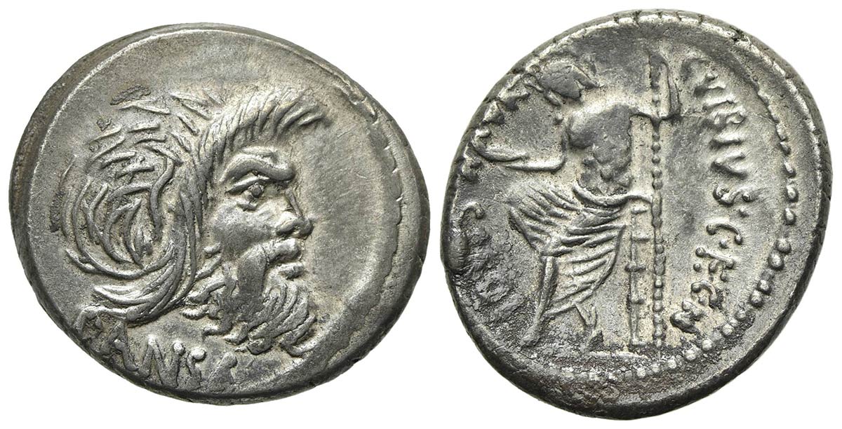 C. Vibius C.f. C.n. Pansa Caetronianus, Denarius, Rome, 48 BC. AR (g 3,84; mm 18; h 9). Mask of Pan r.; PANSA below, Rv. Jupiter Axurus seated l., holding patera and sceptre; C•VIBIVS•C•F•C•N to r., IOVIS AXVR to l. Crawford 449/1