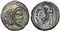 C. Vibius C.f. C.n. Pansa Caetronianus, Denarius, Rome, 48 BC. AR (g 3,61; mm 18; h 11). Mask of Pan r.; PANSA below, Rv. Jupiter Axurus seated l., holding patera and sceptre; C•VIBIVS•C•F•C•N to r., IOVIS AXVR to l. Crawford 449/