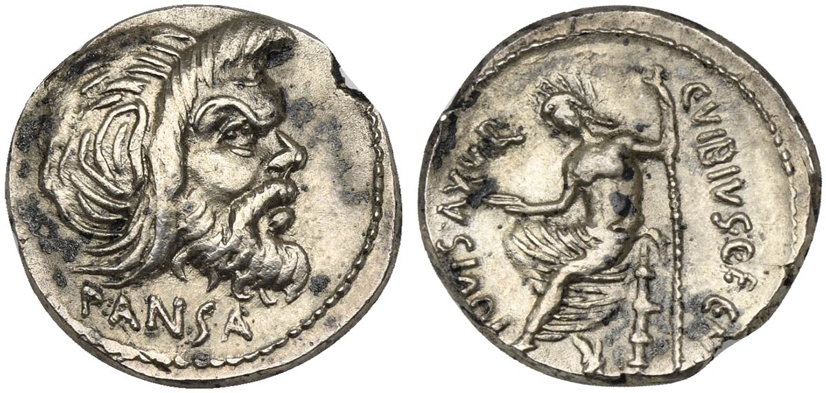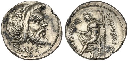 C. Vibius C.f. C.n. Pansa Caetronianus, Denarius, Rome, 48 BC. AR (g 3,16; mm 18; h 5). Mask of Pan r.; PANSA below, Rv. Jupiter Axurus seated l., holding patera and sceptre; C•VIBIVS•C•F•C•N to r., IOVIS AXVR to l. Crawford 449/1