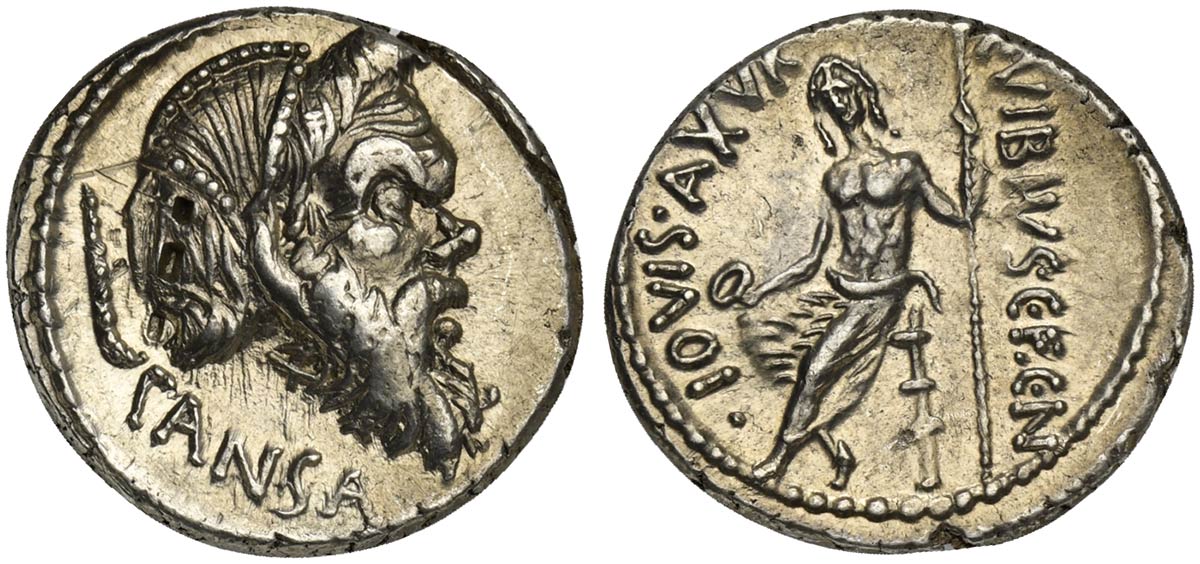 C. Vibius C.f. C.n. Pansa Caetronianus, Denarius, Rome, 48 BC. AR (g 4,04; mm 19; h 5). Mask of Pan r.; pedum behind, PANSA below, Rv. Jupiter Axurus seated l., holding patera and sceptre; C•VIBIVS•C•F•C•N to r., IOVIS AXVR to l.