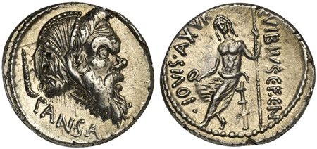 C. Vibius C.f. C.n. Pansa Caetronianus, Denarius, Rome, 48 BC. AR (g 4,04; mm 19; h 5). Mask of Pan r.; pedum behind, PANSA below, Rv. Jupiter Axurus seated l., holding patera and sceptre; C•VIBIVS•C•F•C•N to r., IOVIS AXVR to l. Crawford 449/1b; Vibia 19; Sydenham 948. Good very fine - near extremely fine
