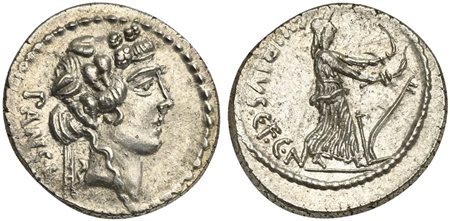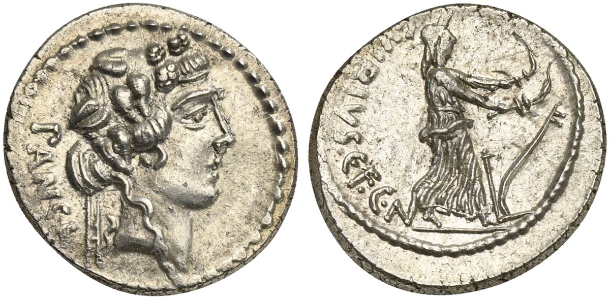 C. Vibius C.f. C.n. Pansa Caetronianus, Denarius, Rome, 48 BC. AR (g 3,97; mm 20; h 6). Head of young Bacchus (or Liber) r., wearing ivy wreath; PANSA behind, Rv. Ceres advancing r., holding a torch in each hand; plow to r.; C•VIBIVS•C•F•C•N to l. Crawford 449/2; Vibia 16; Sydenham 946. Good very fine