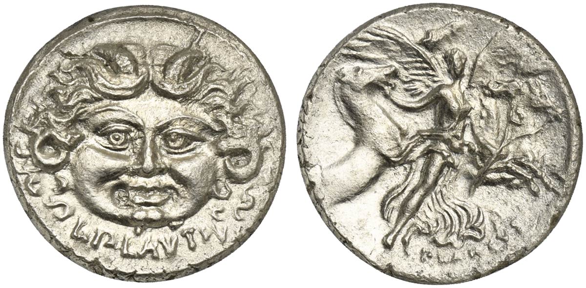 L. Plautius Plancus, Denarius, Rome, 47 BC. AR (g 3,54; mm 19; h 8). Facing head of Medusa with disheveled hair; serpents on either side; L•PLAVTIVS below, Rv. Aurora, flying r., head facing slightly l., holding reins in each hand