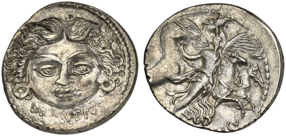 L. Plautius Plancus, Denarius, Rome, 47 BC. AR (g 4,10; mm 19; h 8). Facing head of Medusa with disheveled hair; serpents on either side; L•PLAVTIVS below, Rv. Aurora, flying r., head facing slightly l., holding reins in each hand