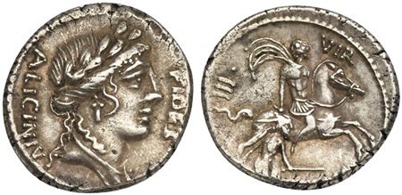 A. Licinius Nerva, Denarius, Rome, 47 BC. AR (g 3,69; mm 18; h 1). Laureate head of Fides r.; A•LICINIVS behind, FIDES before, Rv. Horseman galloping r., dragging Celtic warrior by the hair; III•VIR above, [NERVA] below. Crawford