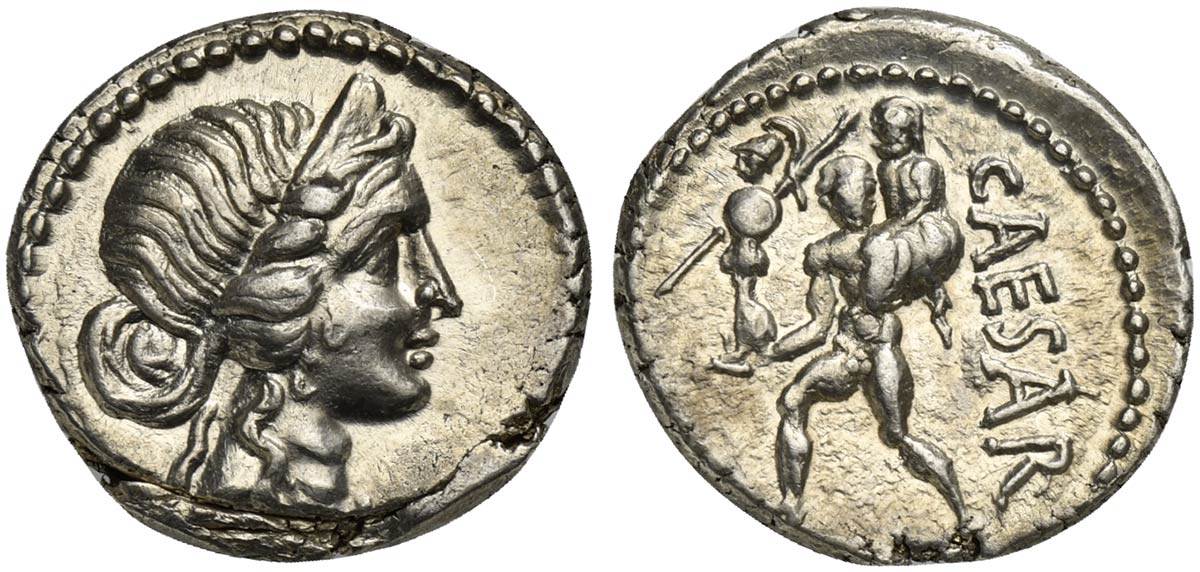 Julius Caesar, Denarius, military mint in North Africa, late 48-47 BC. AR (g 3,92; mm 18; h 6). Diademed head of Venus r., Rv. Aeneas advancing l., holding palladium and bearing Anchises on his shoulder; CAESAR to r. Crawford 458/