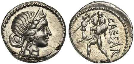 Julius Caesar, Denarius, military mint in North Africa, late 48-47 BC. AR (g 3,92; mm 18; h 6). Diademed head of Venus r., Rv. Aeneas advancing l., holding palladium and bearing Anchises on his shoulder; CAESAR to r. Crawford 458/1; RSC 12; Sydenham 1013. Good very fine