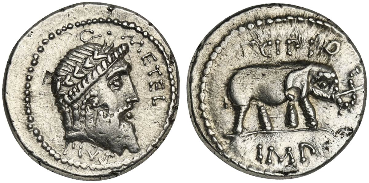 Q. Caecilius Metellus Pius Scipio, Denarius, military mint in Africa, 47- Spring 46 BC. AR (g 3,92; mm 18; h 9). Laureate head of Jupiter r.; Q•METEL PIVS, Rv. African elephant walking r.; SCIPIO above, IMP below. Crawford 459/1; Caecilia 47; Sydenham 1046. Very fine - good very fine