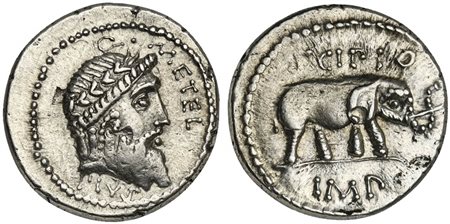 Q. Caecilius Metellus Pius Scipio, Denarius, military mint in Africa, 47- Spring 46 BC. AR (g 3,92; mm 18; h 9). Laureate head of Jupiter r.; Q•METEL PIVS, Rv. African elephant walking r.; SCIPIO above, IMP below. Crawford 459/1;