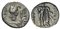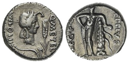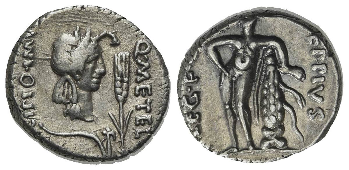 Q. Caecilius Metellus Pius Scipio and Eppius, Denarius, military mint traveling with Scipio in Africa, 47- Spring 46 BC. AR (g 3,92; mm 15,5; h 12). Head of Africa r., wearing elephant skin headdress; stalk of grain to r., plow be