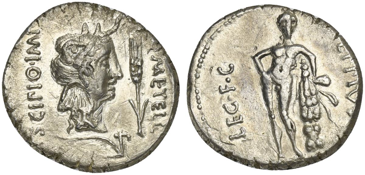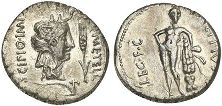 Q. Caecilius Metellus Pius Scipio and Eppius, Denarius, military mint traveling with Scipio in Africa, 47- Spring 46 BC. AR (g 3,52; mm 18; h 5). Head of Africa r., wearing elephant skin headdress; stalk of grain to r., plow below; Q•METELL to r., SCIPIO•IMP to l., Rv. Hercules standing facing, with hand on hip, leaning on club draped with lion skin and set on rock, EPPIVS to r., LEG•F•C to l. Crawford 461/1; Caecilia 50a; Sydenham 1051. Very fine